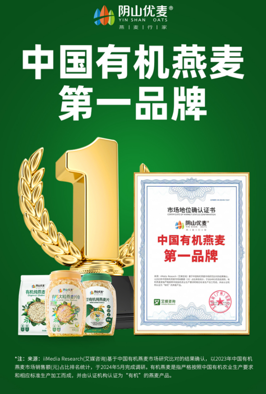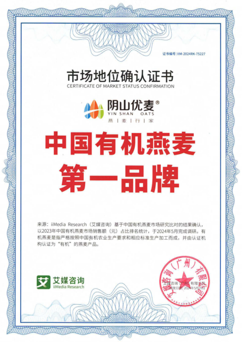iiMedia Research(艾媒咨詢)是全球新經(jīng)濟產(chǎn)業(yè)第三方數(shù)據(jù)挖掘和分析機構(gòu),基于中國有機燕麥市場研究比對的結(jié)果確認,以2023年中國有機燕麥市場銷售額(元)占比排名統(tǒng)計,于2024年5月完成調(diào)研。其中,有機燕麥是指嚴格按照中國有機農(nóng)業(yè)生產(chǎn)要求和相應標準生產(chǎn)加工而成,并有認證機構(gòu)認證為“有機”的燕麥產(chǎn)品。此次艾媒咨詢授予陰山優(yōu)麥“中國有機燕麥第、一品牌”市場地位確認證書,也是對陰山優(yōu)麥長期致力于推廣有機燕麥、保障食品安全、提升燕麥產(chǎn)品品質(zhì)的認可。